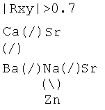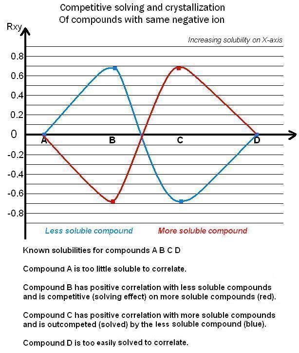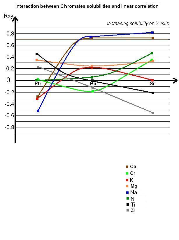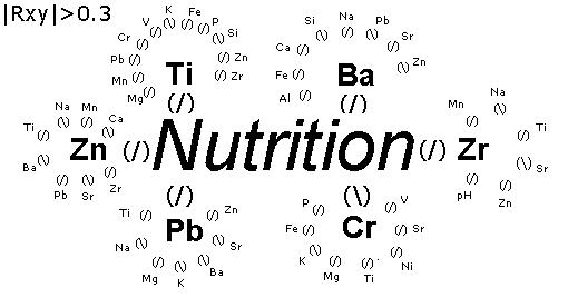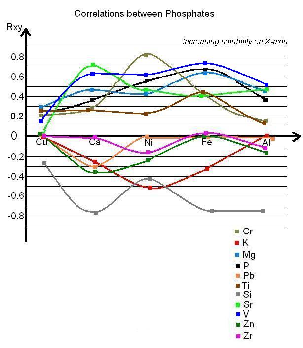 TABLE OF CONTENTS SulfatesPotassium has a curve-shape that indicates an easy to solve sulfate. Copper is easy to solve as sulfate and follow the height-curve downhill. The over layer of the ground is called oxidationzone, as oxygen easier access the soil, and causes the sulfate ion to dominate over sulfide. In deficiency of oxygen an microbial reaction with organic compounds reduces the sulfate back to sulfide in the presence of hydrogen ions. 4 Fe(OH)3 + 4 SO42- + 9 CH2O + 8 H+ → 4 FeS + 9 CO2 + 19 H2O Barium is one of the strong competitors binding sulfate, and according to this theory release nutrients in the surface oxidationzone of the soil, but is easily dissolved as sulfide and thus washed downhill. TABLE OF CONTENTS CarbonatesThis diagram is strongly affected by other processes but potassiumcarbonate (pearlash) has a mid-range peak at the solubility of barium carbonate. Perhaps due to random fluctuations in the web of correlations.TABLE OF CONTENTS ChromatesThis vague diagram of chromates with only three known coordinates still shows the coherency along the line of solubility according to linear regression between the elements.TABLE OF CONTENTS PhosphatesThe phosphates present in the diagram show that potassium phosphate is easily solved in comparison to nickel phosphate, that has positive synergy towards chrome phosphate.Phosphorus occurs as phosphate PO43-. When binding sulphide with an excess zirconium such as ZrS2, leaching pathways for phosphorus increase along with potassium and sodium phosphate. Available plant nutrition is increasing, phosphate is leached into deficit and the soil is then depleted. However, when increasing the amount of free sulfur, leaching and availability of phosphorus decreases. TABLE OF CONTENTS Silica compoundsSilica has negative correlation towards:Al,P,Fe,Ca,Mg,Mn,Na,Ti,Ba,Cu,Cr,Mo,Ni,Sr,V Silica has positive correlation towards: K,Pb,Zn,Zr and all of them (including Silica) have positive correlation to pH in river-water. This can be explained by the inhibiting of the H+ releasing sulfide oxidation to sulfate indicating a possible accessible plant-nutrient increase. Silic acid (H4SiO4) also has an high pKa that rises the pH. Silica has as the largest soil component a negative correlation towards nutrition, most likely because of long term competitive solving effect on nutrients (causing deficiency), this is a perspective on the other hard to solve competitive compounds as well. Most likely SiO2 and silic acid reacts with acids and sulfides in order to form silicates of differing solubilities, hence explaining the vast majority of the elements yeilding negative correlations towards silicon in this database. Zirconium, zinc and lead are assumed not to form silicates from their hydroxides, and are not depleted by silica in the database (but have slightly positive correlation). TABLE OF CONTENTS Clusters separating along height-curvePositive correlation is signed with (/)Negative correlation is signed with (\) These elements stay uphill the height-curve, except potassium that is solved and transported downhill.