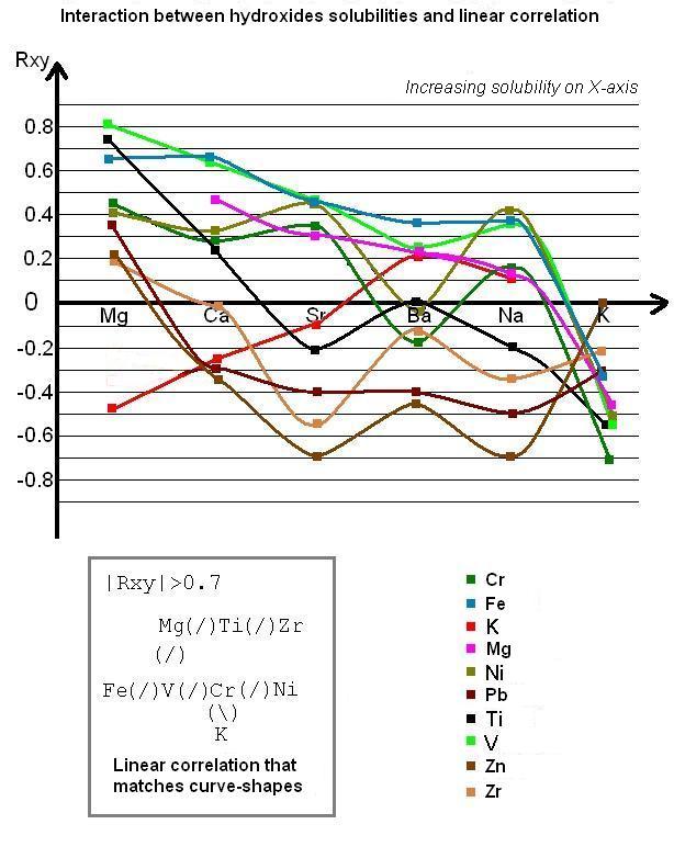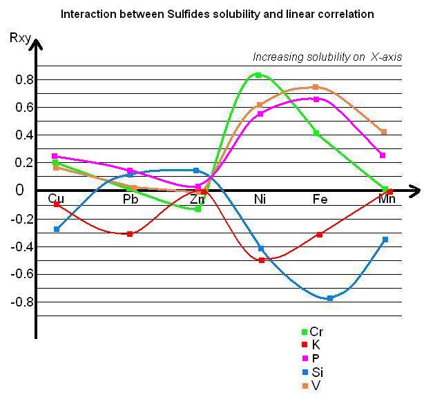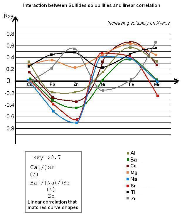 TABLE OF CONTENTS HydroxidesThe diagram of hydroxide solubility shows the difference between potassium and magnesium and the coherency of the curves between elements with strong linear correlation.TABLE OF CONTENTS SulfidesThe simple coherency of the curves for barium, calcium, sodium and strontium indicates an easy to solve sulfide crystallization, and they are outcompeted by the less soluble compounds.Zirconium shows an inverted curve with positive correlation to lead and zinc sulfide, indicating less soluble characteristics. Titanium also has a curve-shape that indicates insolubility as sulfide. Interesting that these hard to solve sulfides have a positive correlation towards pH in river-water, though sulfide oxidation to sulfate releases hydrogen ions. The hard to solve sulfide compounds seem to inhibit the lowering of pH in river-water in a competitive way. The solubility and reactivity of the compounds determine cyclic dissolving and crystallization. As shown in the formula below, the oxidation-process releases hydrogen ions. Hard to dissolve compounds inhibit this process in a competitive way, increasing the pH in close river water and release of more easily dissolved compounds (several nutrients).